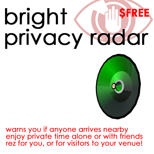 The Bright Privacy Radar will warn you if anyone arrives nearby while you are working, chatting with friends, or getting squelchy with someone you love. With a real audio alarm, it is much harder to miss than a new name on your HUD avatar scanner.