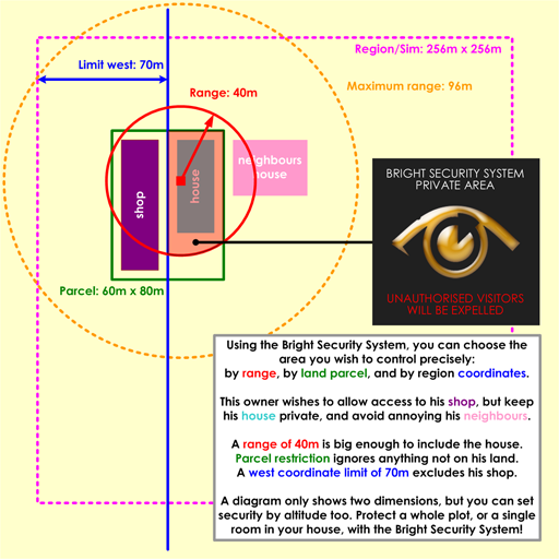 You can define the *space* you wish to protect with absolute precision. You can simply say "anywhere within 96m", you can automatically exclude anywhere within range but outside your parcel, or you can even use pairs of X, Y and Z region coordinates to define a space absolutely precisely. For instance, you can secure a single, rectangular room within your house, without affecting anyone outside, above, or below.